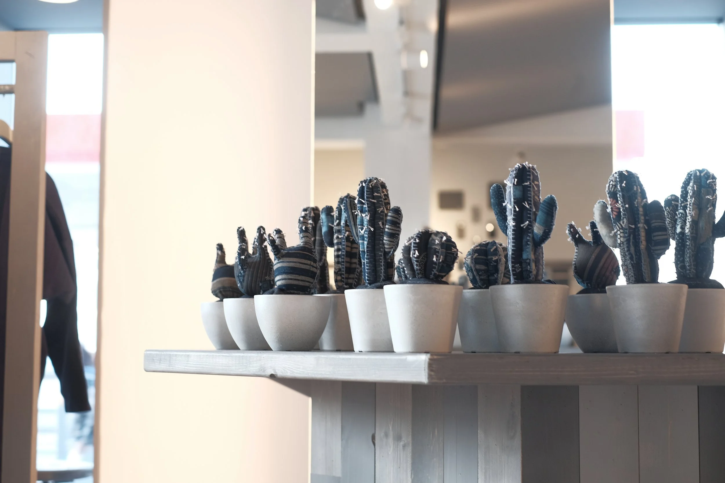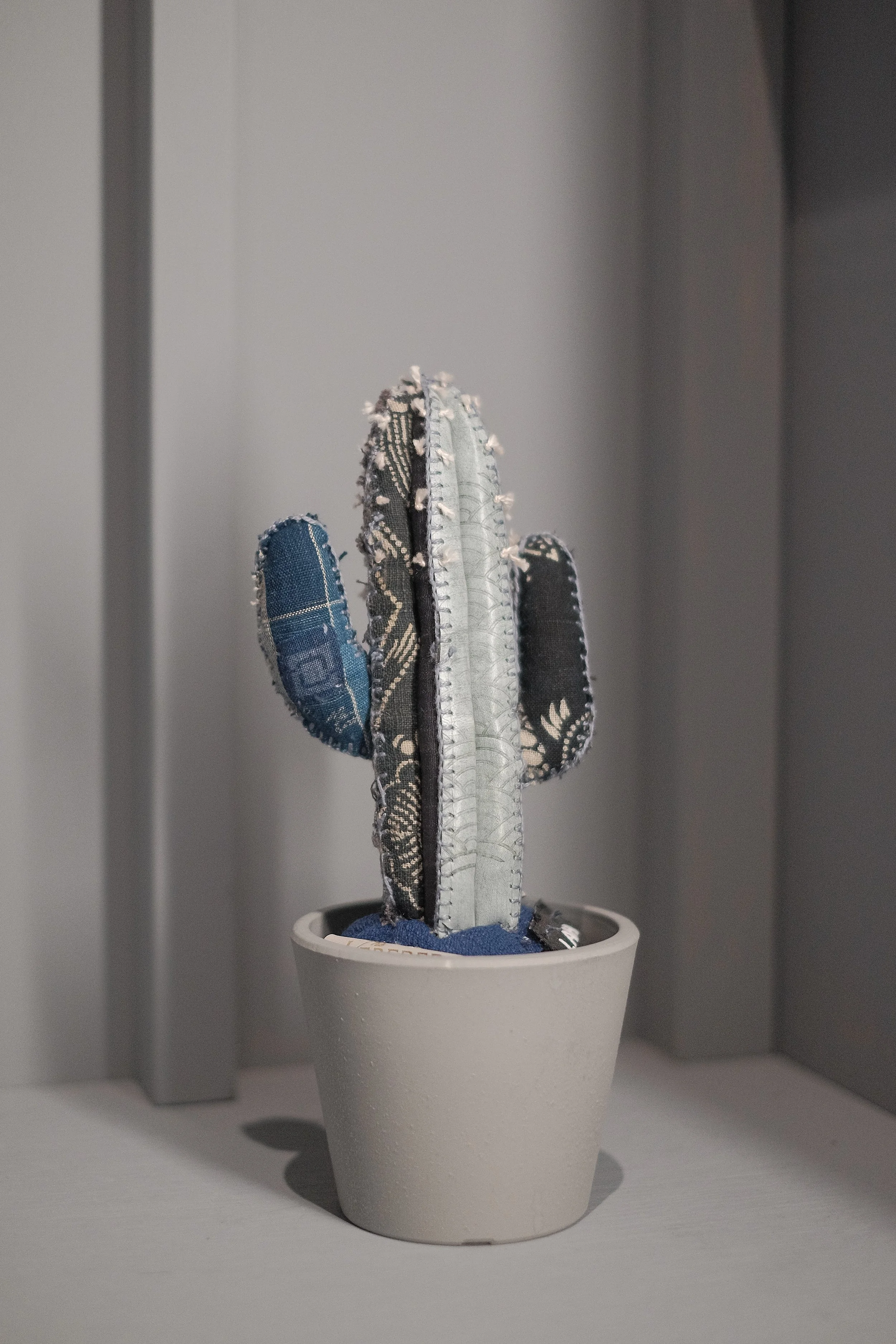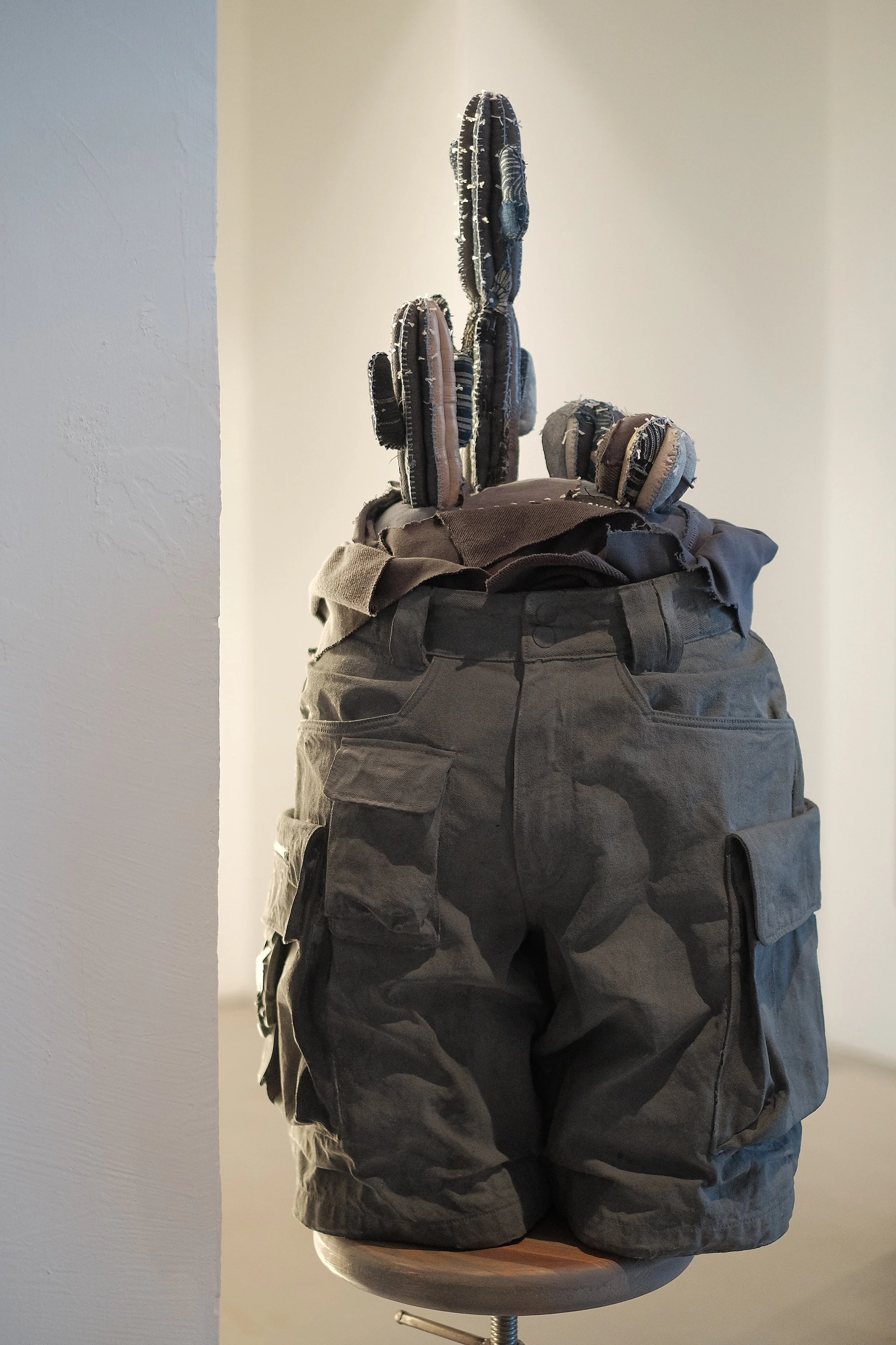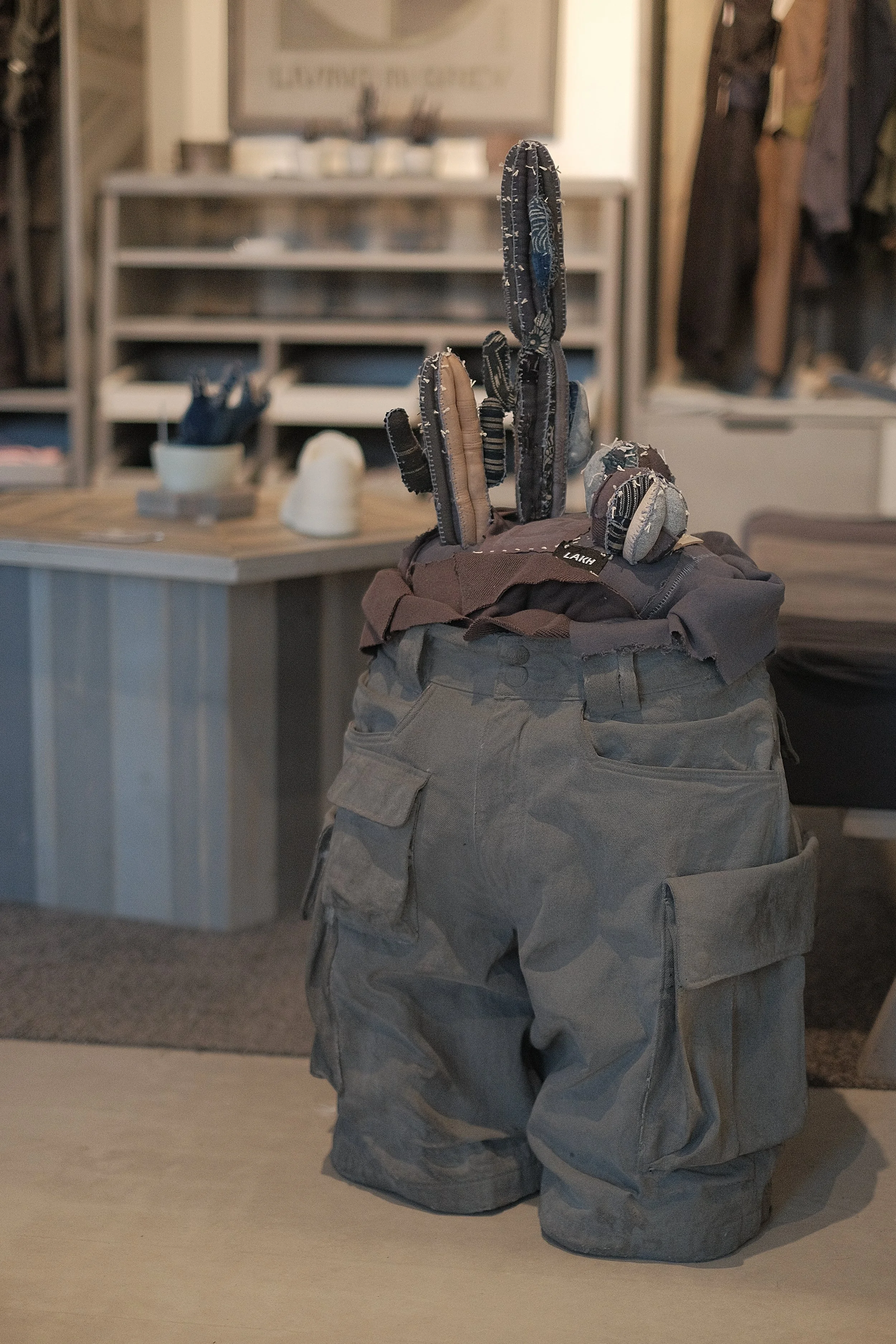 LAKH producing urban outdoor functional garments in Hong Kong. LAKH provided leftover fabrics from their own production, and collected remnants from Hong Kong's last leather factory. 222 used these materials, along with vintage fabrics, to sew mixed-material BORO BONSAI, up-cycling and capture the legacy.