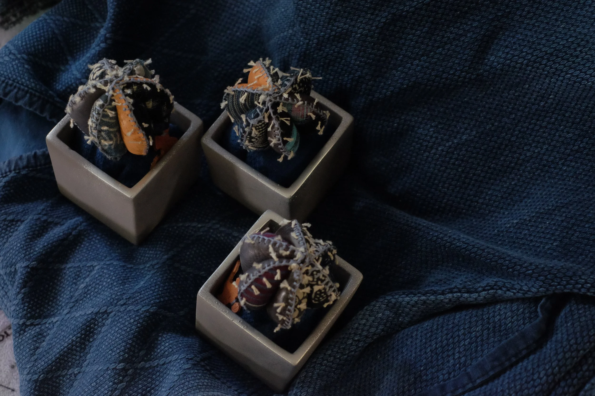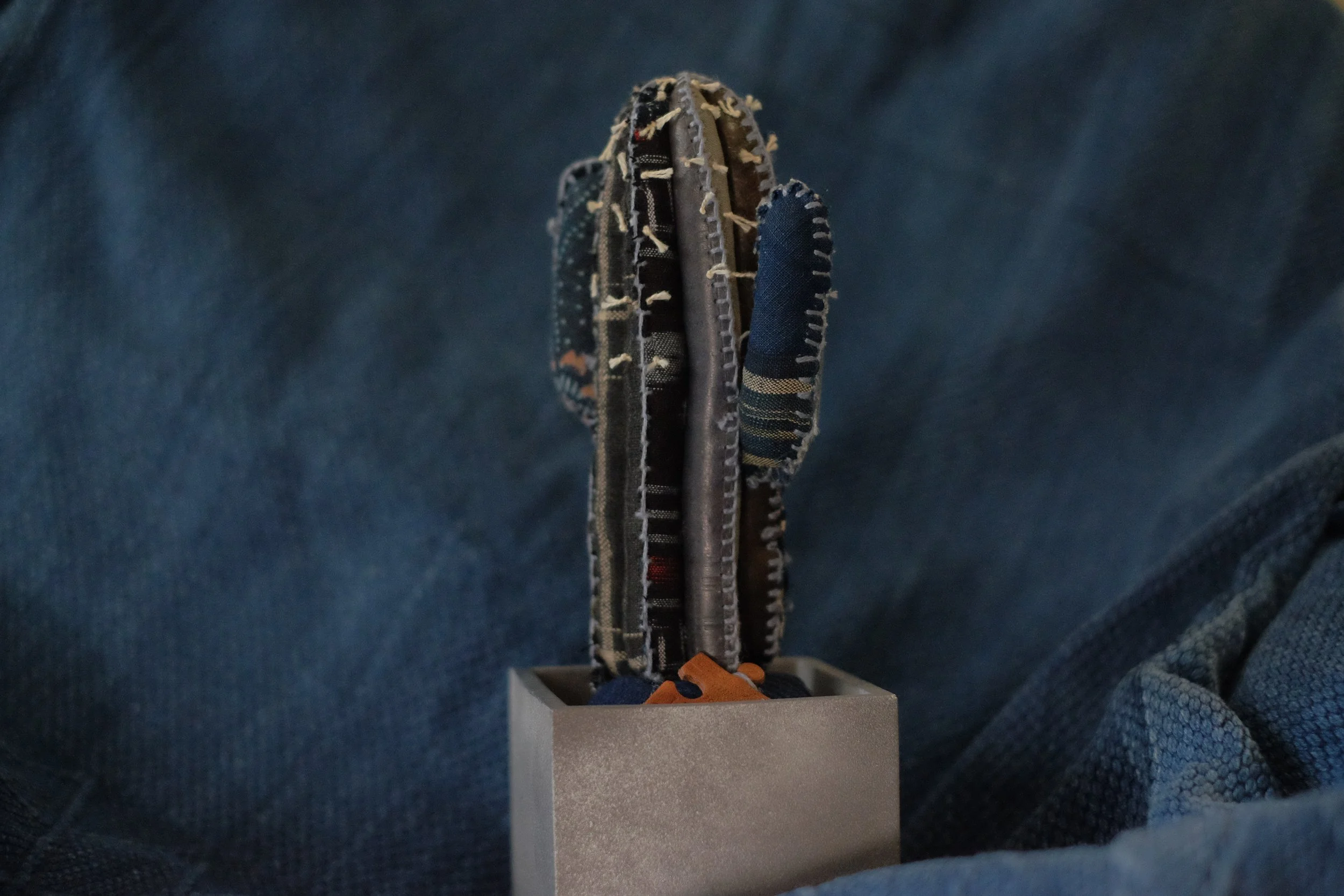 Vegetable-tanned leather meets naturally indigo-dyed vintage fabric; one darkens under sunlight, the other fades. watch the same bonsai evolve uniquely over the years.